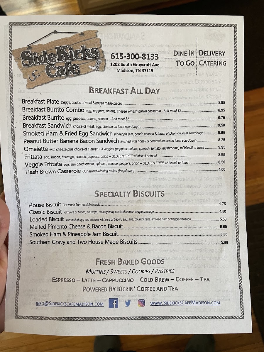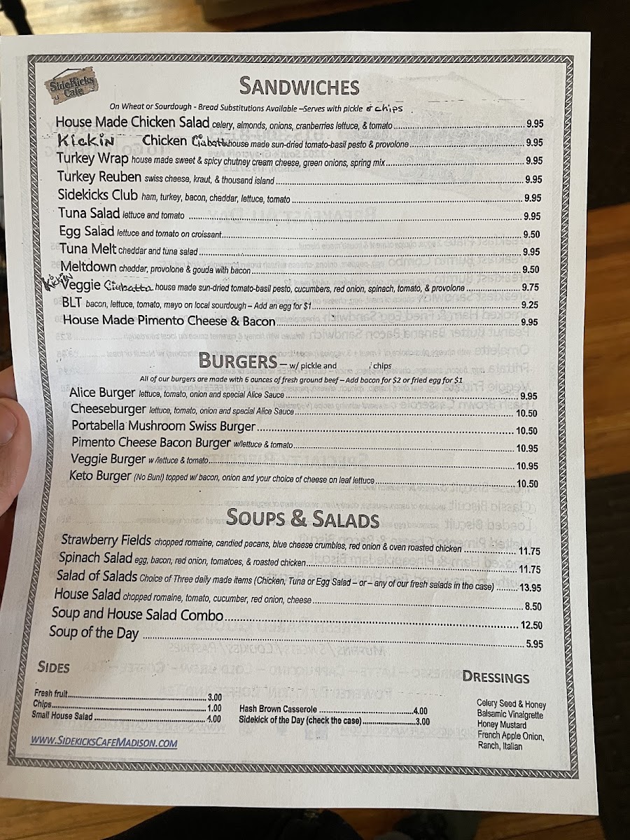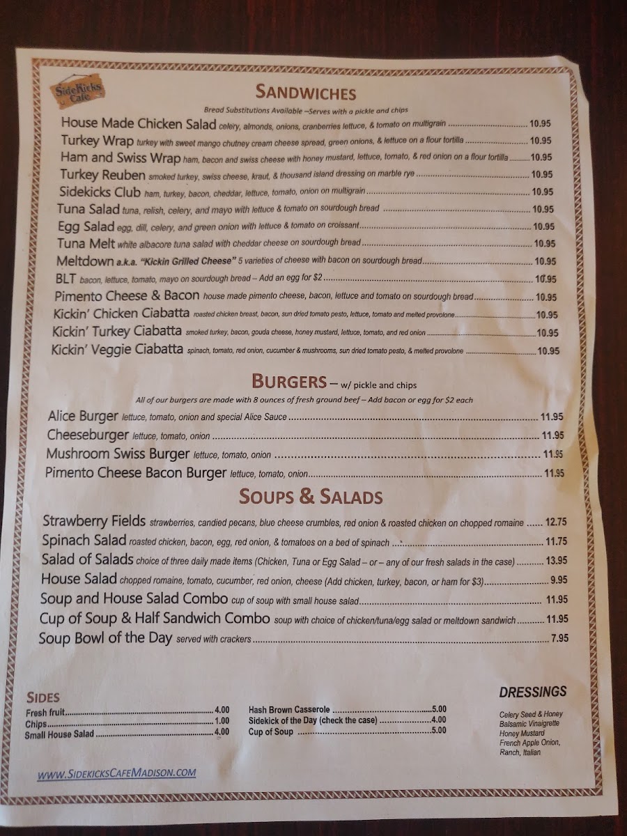 Welcome to SideKicks Café, a delightful gem nestled at 1202 S Graycroft Ave in Madison, TN! This charming café invites you into a warm atmosphere reminiscent of home, with its rich aroma of fresh coffee and baked goods. The menu is a culinary journey, featuring scrumptious burgers such as the Pimento Cheese Bacon Burger and the Mushroom Swiss Burger, each priced at USD 11.95. For those seeking lighter fare, the Strawberry Fields salad and Spinach Salad offer delightful combinations of fresh ingredients for under USD 13.00.